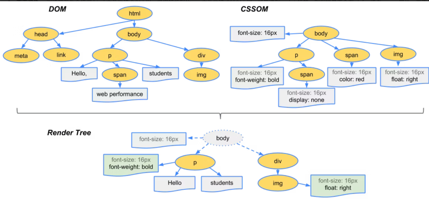 8、页面渲染: 浏览器首先会根据 html 文件构建 DOM 树,根据解析到的 css 文件构建 CSSOM 树,如果遇到 script 标签,则判端是否含有 defer 或者 async 属性,要不然 script 的加载和执行会造成页面的渲染的阻塞。当 DOM 树和 CSSOM 树建立好后,根据它们来构建渲染树。渲染树构建好后,会根据渲染树来进行布局。布局完成后,最后使用浏览器的 UI 接口对页面进行绘制。这个时候整个页面就显示出来了。https://web.dev/critical-rendering-path-render-tree-construction/