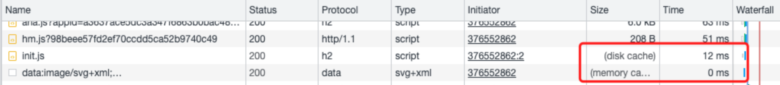 disk cache 是缓存在硬盘空间大持久,memory cache 是缓存在内存中,其实看 memory cache 加载时间多半是 0,因为内存读写速度很快,加载时间几乎为 0