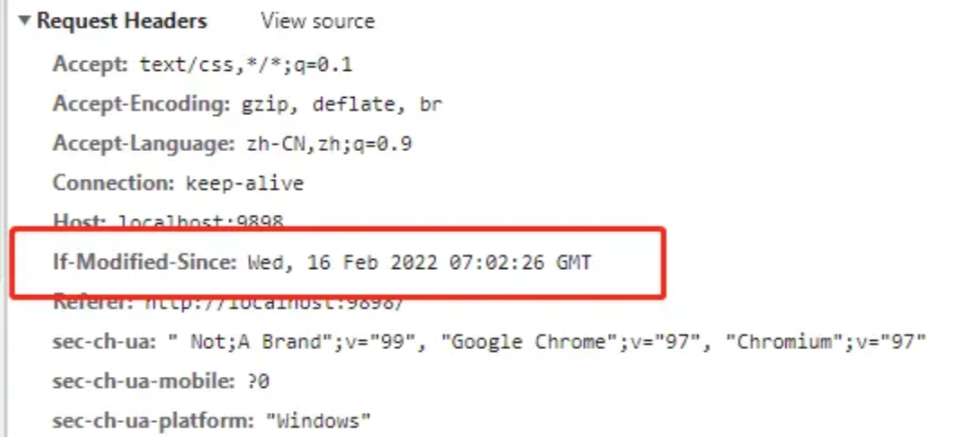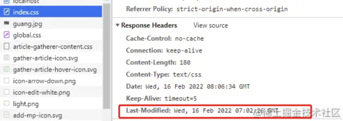在客户端请求资源的时候,服务端会带上资源文件最后的修改时间,放在 Last-Modified 字段中,客户端拿到 Last-Modified 后在下次请求这个资源时会在请求头中以 If-Modified-Since 字段带上最后修改时间,服务器校验时间是否相同,相同则返回 304,客户端收到 304 就读取缓存,如果时间不一样则返回状态码 200 并返回最新文件。